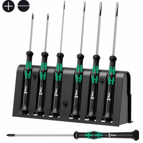 Jeu de 7 tournevis de précision Phillips pour vis à fente et vis cruciform,  son manche ergonomique tricouche permet une transmission optimale de la force pour plus d'efficacite et a été pensé de façon à ce que la zone de précision, juste au dessus de la lame, aide le technicien à facilement trouver le bon angle de rotation. Son dispositif anti-roulement grace à la forme hexagonale du mache au dessus de la lame et sa tête à rotation permettent au technicien de travailler plus vite sans se fatiquer.