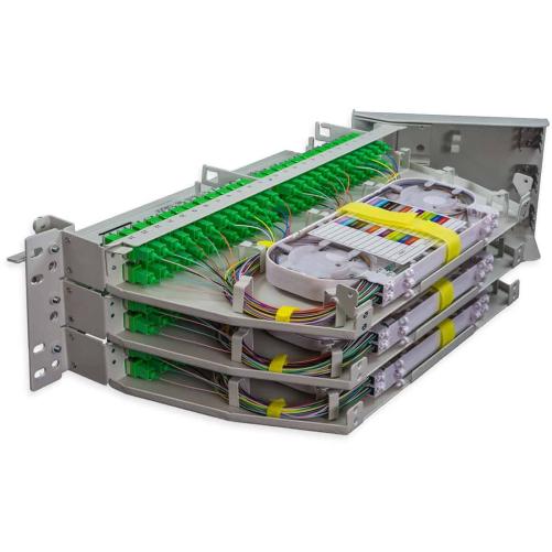 Ce tiroir 19" pivotant modulaire 3U 144 FO avec raccords SC/APC et fibre optique G.657A2 possède une ouverture gauche complète avec pigtails montés, raccords, gestion des fibres, cassettes et supports d'épissure.
