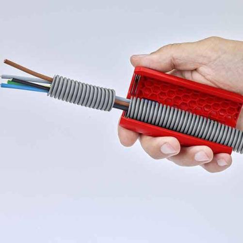 Le coupe-tube KNIPEX pour gaines électriques offre une coupe propre sans risque d'endommager les câbles à l'intérieur du conduit électrique.