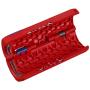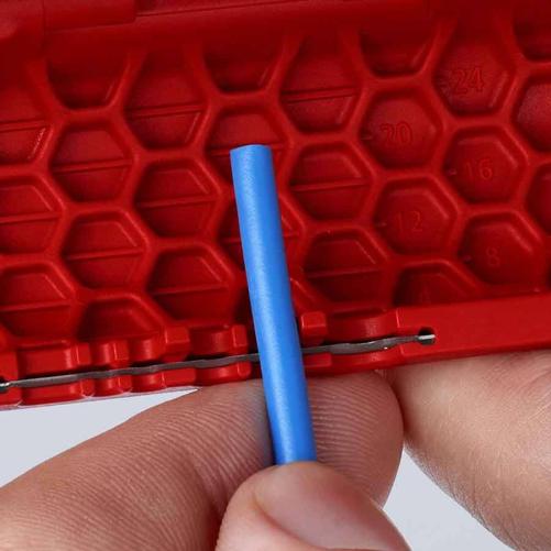 La coupe se fait sur la tranche extérieure grâce à deux lames de guidage, et n'entraine aucun écrasement de la gaine. La coupe se fait en toute sécurité grâce à des lames profondes prévenant tout risque de blessure accidentelle. Son corps en plastique et ses dénudeurs intégrés pour câble de Ø0,2 à 0,4mm font de lui un outil léger et compact.