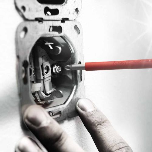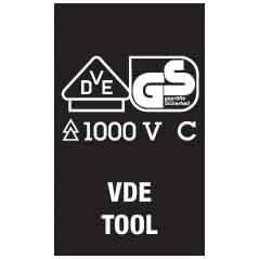 Jeu de tournevis avec isolation de 1000V intégrée dans la lame. Le manche ergonomique est bi-matière. Chaque tournevis compris dans le jeu possède un méplat anti-roulement, une zone dure pour le vissage rapide et une zone molle pour l'adhérence. Le jeu de tournevis est fourni avec un rack de rangement, qui peut être fixé sur un mur ou un établi.