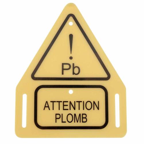 Étiquette jaune triangulaire en PVC tampographiée de la mention "Attention Plomb". Cette étiquette a été développée selon le cahier des charges de la Direction de l'Intervention en charge de la Prévention et de la Sécurité chez ORANGE. Elle est destinée à équiper les ouvrages souterrains ORANGE (chambre, galeries) dans lesquels se trouvent ou ont été déposés des câbles plomb, afin de prévenir les intervenants du risque.