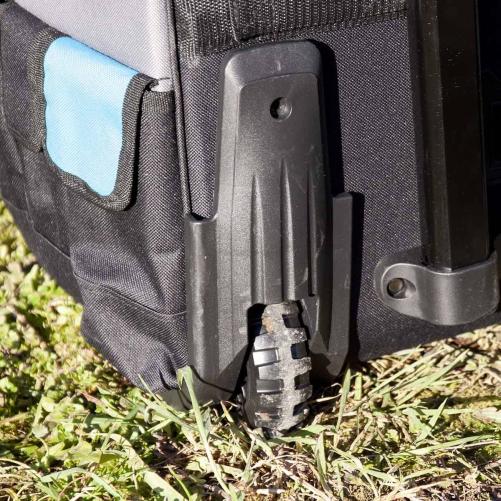 La valise est équipée d'une poignée télescopique et de roues tout terrain. Il est ainsi possible de la déplacer avec un minimum d'effort partout sur les chantiers. Elle conserve par ailleurs 2 anses pour faciliter le transport manuel lorsque celui-ci est nécessaire, dans des escaliers par exemple.
