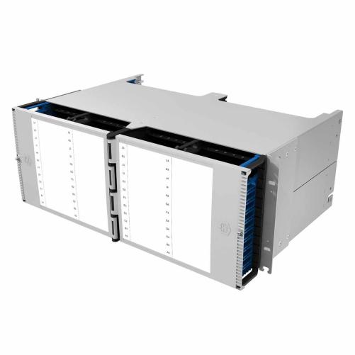 Le châssis standard IANOS® 4U est conçu pour des applications à haute densité où les connexions aux serveurs et aux commutateurs à haute densité sont nécessaires dans le même rack ou dans des racks adjacents. Généralement monté au-dessus ou au-dessous des commutateurs, le châssis supporte jusqu’à 288 ports (576 fibres avec des adaptateurs LC duplex) par 4U d’espace de rack.