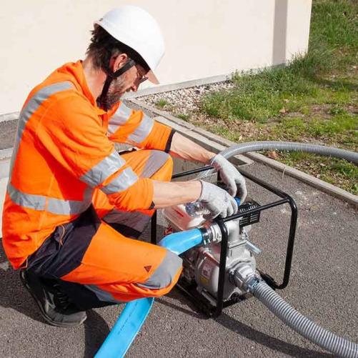 Motopompe 4 temps essence, auto-amorçante jusqu'à 7m pour eaux chargées. Equipée d'une sécurité manque d'huile elle est parfaitement adaptée pour l'épuisement rapide des chambres de tirage, ou vidange de fosses.