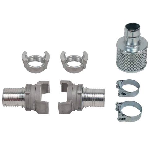 Livrée avec son kit complet d'accessoires : raccords pompier Ø 50mm, colliers et crépine en métal ainsi que le tuyau de refoulement 10m et le tuyau d'aspiration 5m.