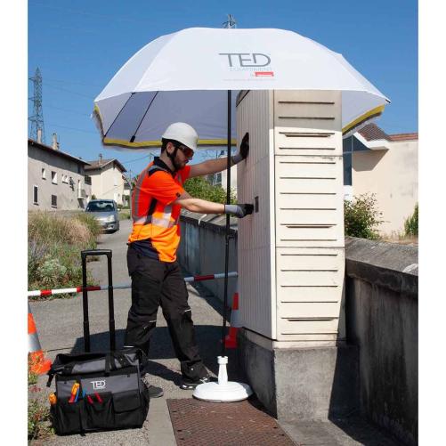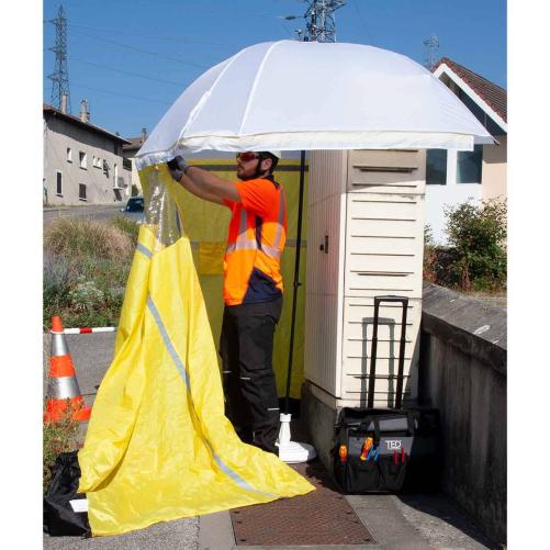La tente fibre optique TED® vous accompagne dans tous vos types d’interventions grâce à sa mise en place simple et rapide : vous voilà à l’abri du soleil et de la pluie en quelques instants. Une toile se rajoute facilement au parapluie grâce à un système de zip robuste. Elle complète le parapluie-tente et peut être maintenue à l’aide de sacs de lestage disposés sur la jupe de protection.