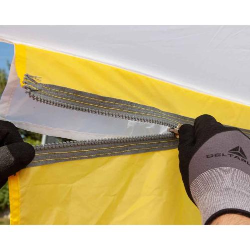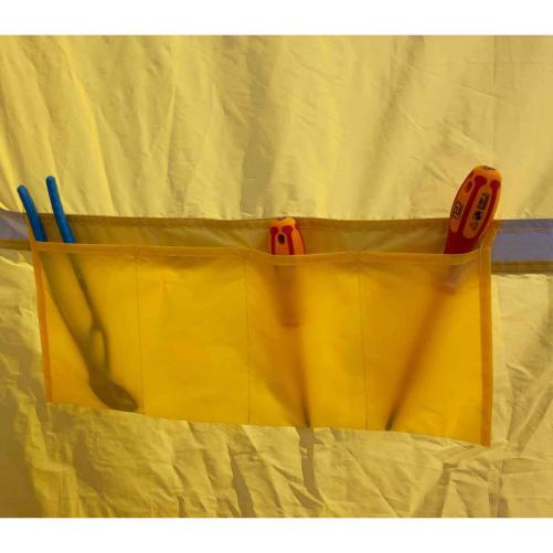 Ce montage complet permet de protéger l’utilisateur des intempéries tout en lui offrant une surface de travail confortable de 170 x 170cm. Il est donc possible d’y réaliser facilement des protections d’épissures ou de faire d'autres manipulations de fibre optique en restant à l’abri. Il y a 6 poches à l'intérieur, spécialement conçues pour contenir les outils qui seront utiles à l’intervention afin de les avoir constamment à portée de main