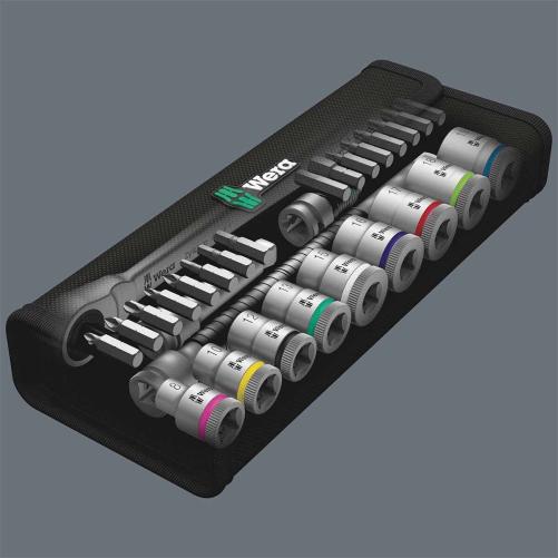 Le jeu de cliquet 3/8 WERA est composée de 29 pièces, comprenant un cliquet avec levier d'inversion, 9 douilles, 16 embouts, 2 barres d'extension et un adaptateur Cyclone.