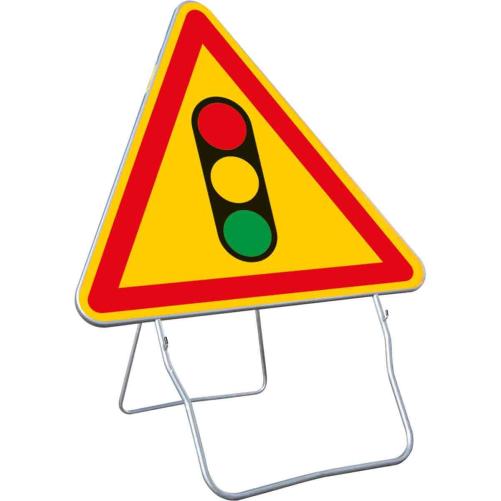 Panneau de chantier signalant la présence d'un feu tricolore provisoire et la mise en place d'une circulation alternée. En acier galvanisé, il fait preuve de robustesse et de légèreté, tout en restant simple et rapide à manipuler. Le montage sur pied lyonnais permet le blocage automatique du pied arrière dans deux positions, ouverte ou fermée.