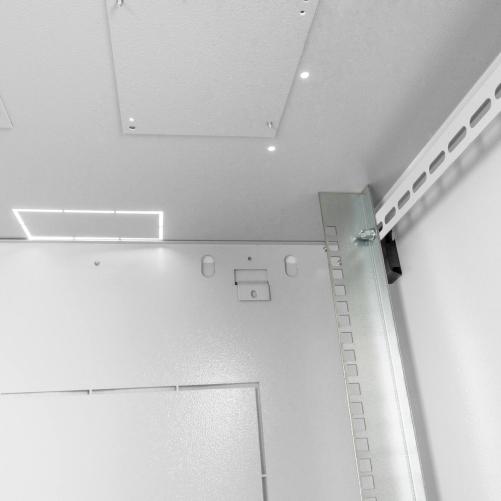 La profondeur maximale de montage est de 36,5 cm. La base, le toit et la paroi arrière comportent des ouvertures pré-perforées pour le passage des câbles qui peuvent être utilisées selon les besoins. La porte en verre de sécurité a un angle d'ouverture de 210°.