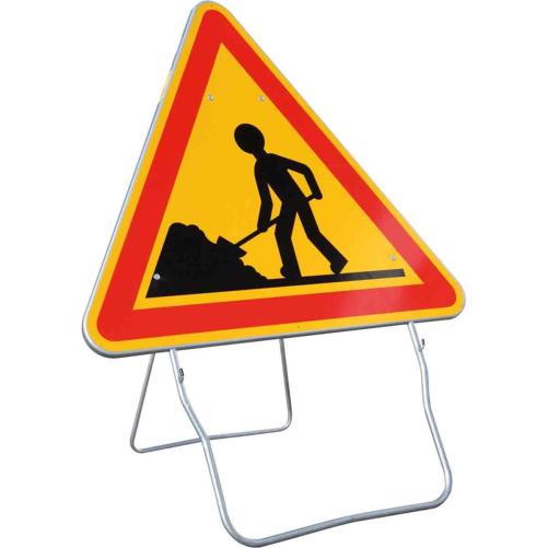 Panneau AK5 temporaire et triangulaire signalant des travaux sur la voie.