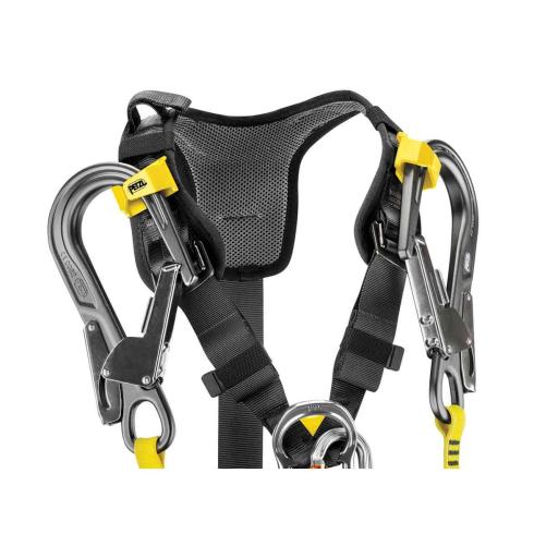 • Il offre un excellent maintien grâce à la ceinture et aux tours de cuisses semi-rigides et larges. Les bretelles possèdent un système permettant de ranger les connecteurs des longes antichute et de les garder à proximité.