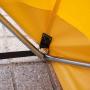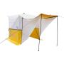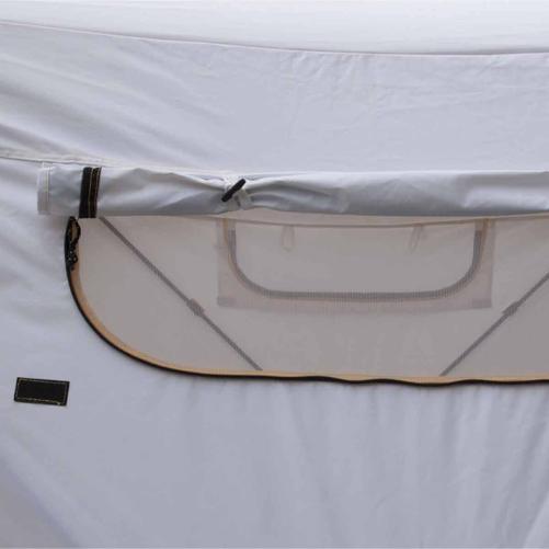 - Fermeture avec zip : les panneaux triangulaires de l’auvent se zippent et se dézippent facilement sur les fermetures éclairs de l’ouverture frontale