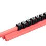 Les cavaliers sont disposés sur leur tige de montage avec des intervalles permettant de les glisser individuellement sur le câble à repérer.