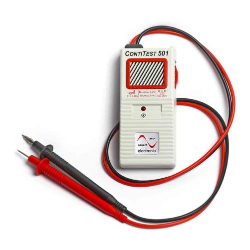 Appareil d'essai polyvalent avec signalisation acoustique et visuelle de la continuité, la résistance et la tension. Plus la résistance est élevée, plus la tonalité est faible. Commutable sur 2 volumes.