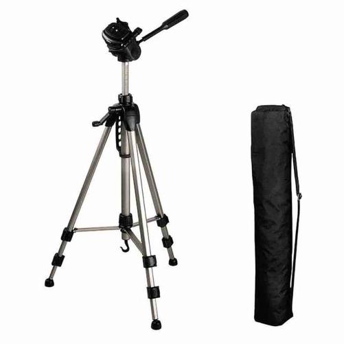 Trépied à utiliser avec un appareil photo ou un caméscope. La manivelle facilite les rotations de l'appareil, et une poignée permet de régler la hauteur facilement.