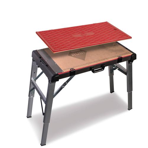 Peu encombrante lorsqu'elle est repliée, son poids de seulement 14.2 kg la rend facilement transportable. De plus, l'établi de travail est ajustable en hauteur afin d'offrir quatre fonctions d'utilisations : échafaudage, chariot, banc de travail et poste mécanique. La table de travail se compose d'un plateau bimatière réversible. D'un coté, un plateau en bois MDF doté d'un convoyeur d'angle et d'une règle directement gravé sur la surface de travail, et un trou d'un diamètre de 25mm permet de perce facilement directement sur l'établi. De l'autre coté, un plateau en polypropylène antdérapant afin que le technicien puisse se tenir debout en hauteur sans risque de chute.