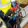 Le descendeur antichute s'installe quant à lui sur la corde et s'arrime au treuil avec la sangle plate pour assurer la charge lors des manipulations et éviter la chute du matériel.