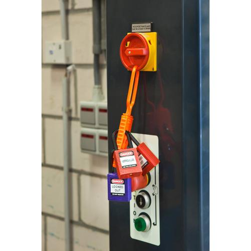 La mâchoire de consignation en nylon diélectrique de la marque BRADY peut accueillir jusqu’à 6 cadenas, elle résiste à des forces de plus de 450 kg.