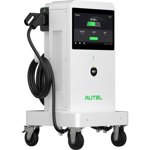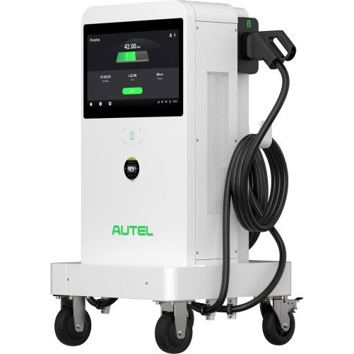 La borne de recharge double MaxiCharger DC Compact sur roulette de Autel offre une puissance élevée allant jusqu' à 47kW dans un design ultra-compact.