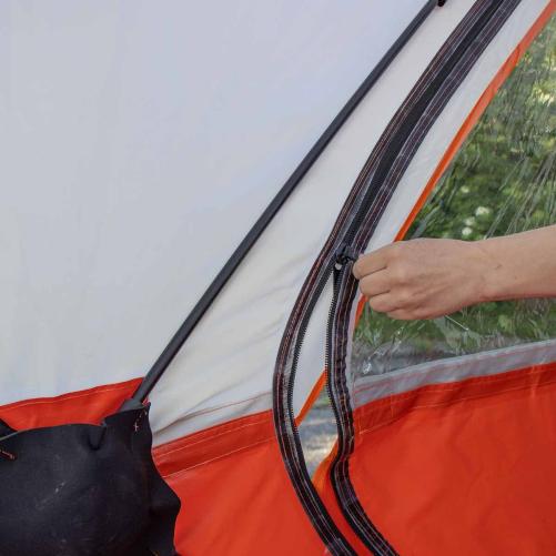 La robustesse et la stabilité conférées par ses arceaux en fibre de verre et ses pieds goupilles en font une tente facile à installer et à transporter. La tente reste compacte une fois pliée dans son sac de transport et prend donc peu de place dans un véhicule. La toile peut être lavée au jet d’eau ou au nettoyeur haute pression, facilitant grandement son entretien.