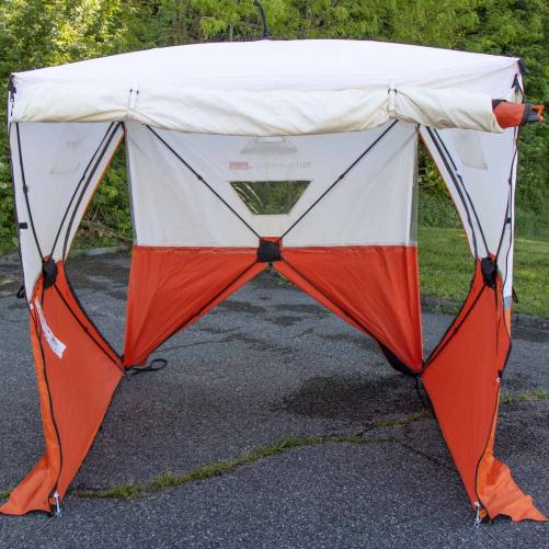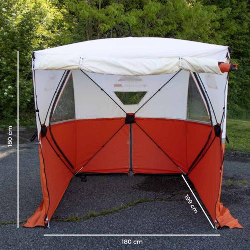 Cette tente peut-être floquée aux couleurs de votre entreprise à l'aide d'une zone fixée par scratch de 42 x 25 cm.