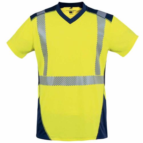 Tshirt haute visibilité, taille XL, de la marque T2S, dans les couleurs jaune et bleu marine afin d'assurer la sécurité des techniciens lors de leurs interventions répondant à la norme ISO 20471 de classe 2.