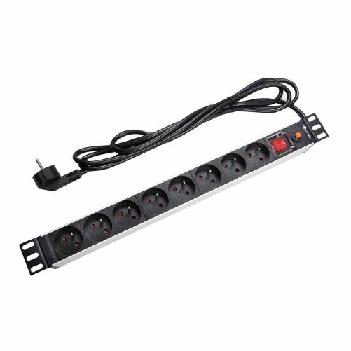 PDU 19" 1U. Dotée de 8 prise, d'un interrupteur et d'un cordon de 3 mètres, cette multiprise est adaptée aux panneau de brassage et peut se fixer facilement grace à ses fixations orientables.