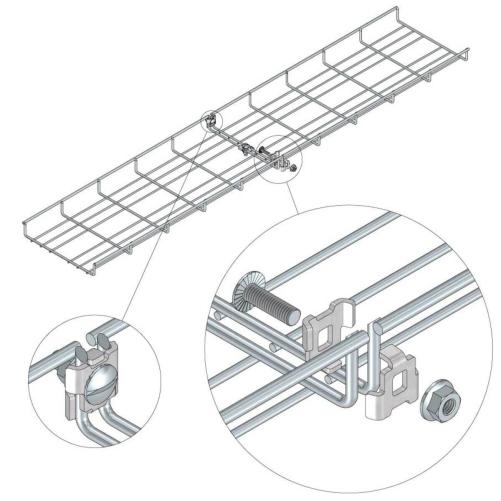 Sa forme permet une fixation mécanique par clipsage entre les deux extrémités de câble, assurant ainsi une continuité structurelle et une bonne répartition de charge. Particulièrement adaptée aux installations tertiaires ou industrielles, elle est idéale pour les installations suspendues ou murales.
