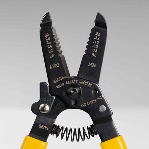 Pince à dénuder JIC-2030 pour fils de 20 à 30 AWG (soit 0,81 à 0,25mm). Ouverture par ressort hélicoïdal pour minimiser la fatigue lors d'utilisations prolongées. Les trous de cintrage sont idéalements situés pour plier et couper le fil facilement. La pince contient un mécanisme de verrouillage. Surfaces de coupe durcies pour une meilleure performance.