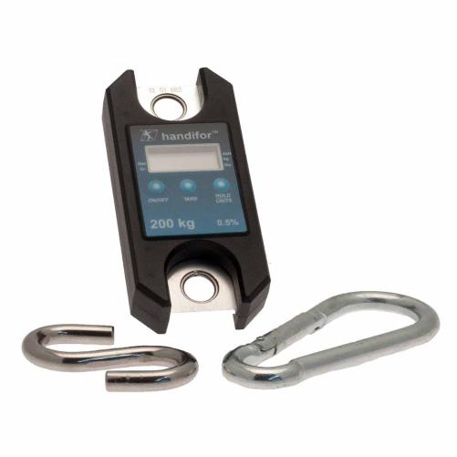 Dynamomètre électronique 200kg spécialement adapté à la mesure de l'effort de tirage des câbles optique aériens. Il est livré avec deux crochets S et une pochette de protection.