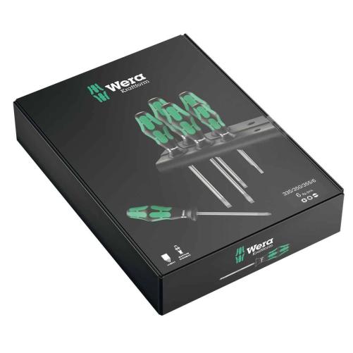 jeu de 6 tournevis WERA, composé de tournevis pour électricien pour vis à fente, vis cruciformes Phillips-Recess et Pozidriv. Dotés d'un manche tricouche avec la technologie Kraftform pour une transmission optimale de la force, ces tournevis offrent un travail de haute qualité rapide et sans fatigue..