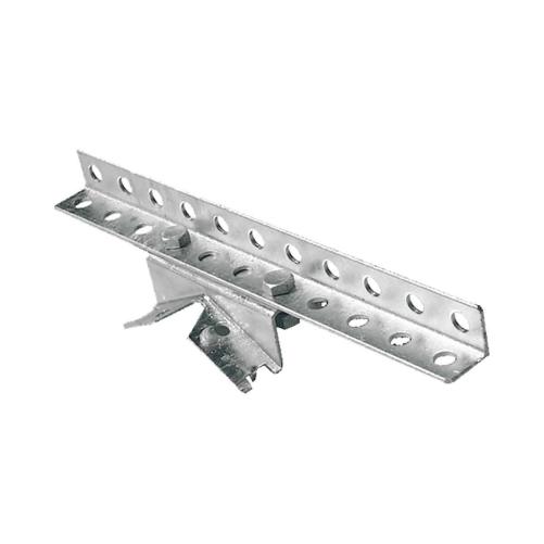 Une semelle CPB suffit pour la fixation d'une traverse appui commun sur poteau bois. La fixation de la traverse se fait par deux boulons d'assemblage 1/12. La semelle se cercle sur le poteau à l'aide de deux feuillards 20 x 0,7mm.